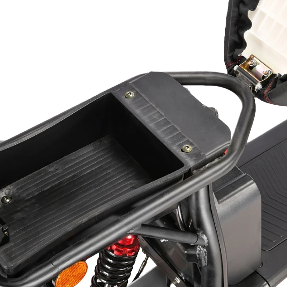 Трехколесный вариант электроскутера оснащен большими устойчивыми колесами, широким мягким сиденьем и вместительной кофрой. Техника оснащена всем необходимым для активного время провождения, поездки на рыбалку или другой вид отдыха.