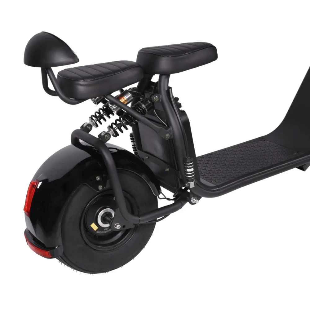 Электроскутер CityCoco Kugoo C2 PRO - усовершенствованный вариант уже полюбившейся и хорошо зарекомендовавшей себя модели. В данной модификации производители предусмотрели более мощный двигатель и аккумулятор. Теперь электроскутер быстро и плавно разгоняется до 45 км/час, легко преодолевает препятствия и подъемы. Одного заряда батареи хватает для преодоления 45-ти километров пути. Этого вполне достаточно для поездок в течение всего дня. Главным преимуществом данной модели является дополнительное сидение для пассажира. Улучшенная амортизация и усиленная подвеска позволяют пользоваться электроскутером вдвоем, что значительно расширяет область его применения. Благодаря широким 8-ми дюймовым колесам, ездить на электроскутере возможно не только по ровным городским улицам, но и по бездорожью. Данная модель оснащена качественной системой освещения. Яркая передняя фара, задние габаритные огни и поворотники повышают безопасность движения в темное время суток и предупреждают других участников движения о совершаемых маневрах. Надежные гидравлические тормоза чутко реагируют на команду райдера и гарантируют быструю остановку электроскутера Kugoo C2 PRO в экстренной ситуации.