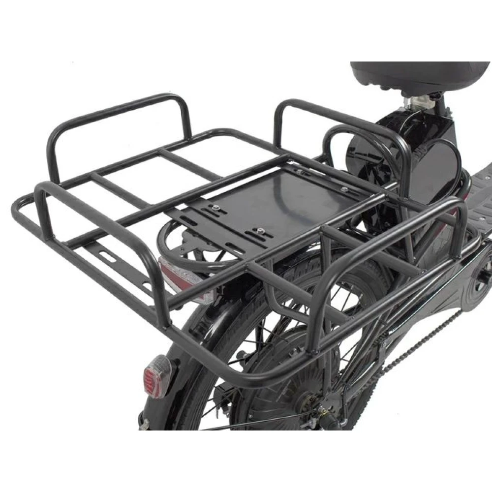 Комфорт езды обеспечен мягким анатомическим седлом и устойчивой подножкой. Безопасность езды передней светодиодной фарой и информативным дисплеем, информирующим о скорости, пробеге и параметрах заряда батареи. 22-дюймовые колеса оснащены везде проходимыми покрышками. Наличие багажника дает возможность перевозки груза при вылазках или продолжительном отдыхе на свежем воздухе.